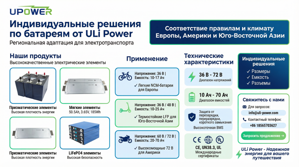 ULi Power предлагает регионально адаптированные решения с литиевыми батареями для электровелосипедов, электроскутеров и электромотоциклов, соответствующие правилам и климату Европы, Америки и Юго-Восточной Азии. Наша продукционная линейка охватывает напряжения 36 В-72 В, емкости 10 Ач-70 Ач, а также оба типа ячеек — NCM и LFP. Все батареи оснащены высокоточной системой управления батареей (BMS) и имеют международные сертификаты (CE, UN38.3, UL). Независимо от того, нужны ли вам легкие NCM-батареи для европейских электровелосипедов, термостойкие LFP для скутеров Юго-Восточной Азии или высокомощные модели 72 В для американских электромотоциклов — мы можем разработать индивидуальные решения по размерам, емкости и разъемам под ваши нужды.