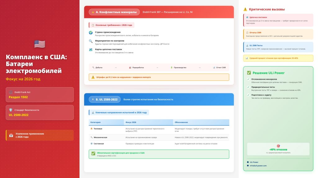 Рыночек США в 2026 году имеет два непреодолимых столпа комплаенса: отслеживание конфликтных минералов (Dodd-Frank 307) и сертификация безопасности батареек UL 2580 — оба направления подверглись существенным обновлениям.