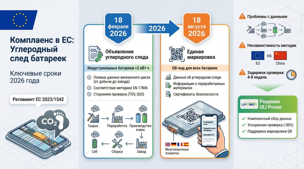 Фокус на ЕС: Проверка углеродного следа, разработка маркировки с QR-кодом и подготовка к Паспорту батареек ЕС 2027 года.