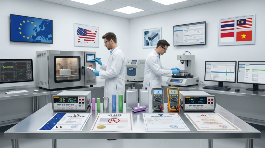 Доступ к рынку ЕС зависит от сертификата CE (включая стандарт EN 62133) и сертификата на транспортировку UN 38.3. Обновления 2024 г. в большей степени фокусируются на производительности BMS и термической безопасности: